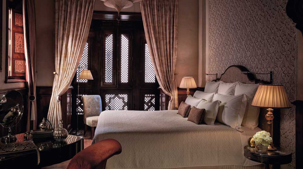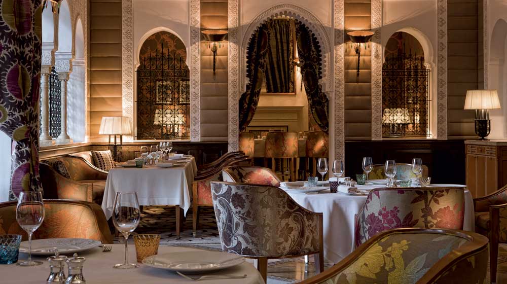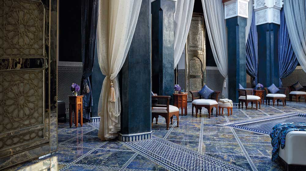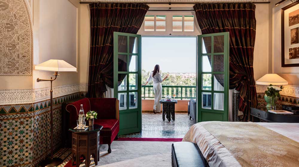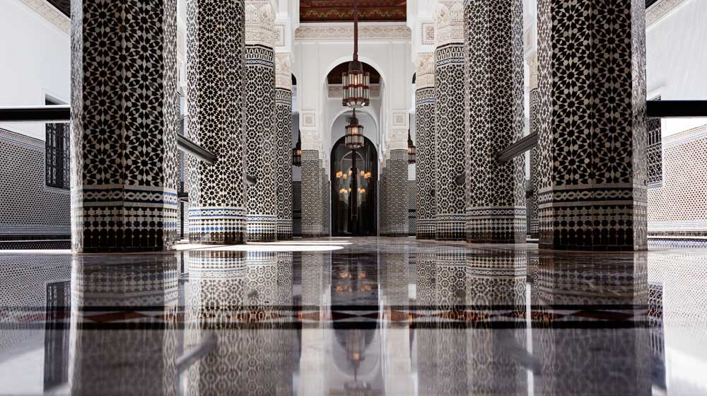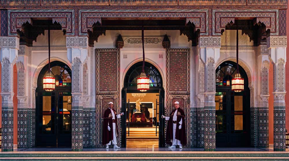 The hotel is owned by King Mohammed VI of Morocco. In 2009 it reopened after a three-year refurbishment which drew from the conventional style of the designer, Jacques Garcia. You see Garcia’s style instantly by walking to the rear of the main lobby, where the corridor to the gardens evolves from a venue for afternoon tea and then live music. This space, about 80 feet long by 15 feet wide and 20 feet high, is called Garcia Theatre, made up of maroon velvet paired with historical woodwork, a ceiling by Jacques Majorelle. By evening, the space is enlivened by a live group playing near the entrance to the garden and, to the left of the space, is the Majorelle Bar.