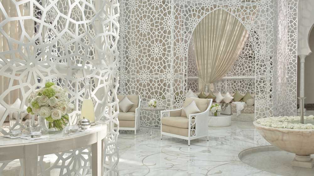 Narrow pedestrian-only streets are a feature of the Medina and here the designers, 3bis, have included narrow walkways in the spa (an amazing structure which, at ground level, has a two floor-high inner shell of white metal fretwork like a giant gazebo; the functional areas of the spa and the gym are relegated below-ground). Even the walkways between buildings are only about three feet wide, and they deliberately twist and turn, to avoid long sight lines. The buildings, terracotta-coloured, have heavy pale turquoise doors, and barely any windows. They have two high storeys that rise about two metres above the rooftop to provide absolute rooftop privacy.