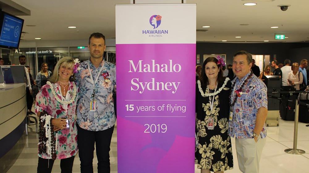 Lead image: Hawaiian Airlines’ Karen Macmillan, Andrew Stanbury and Keiryn Osbourne, with Kathy Mainerd, HA’s Station Manager at Sydney Airport.