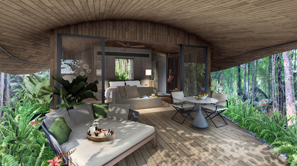 In line with this theme of celebrating nature, the resort’s standard and family rooms will offer views into the rainforest. 24 elevated treehouses are being designed in the shape of seed-pods and will be set among the trees surrounding the resort.