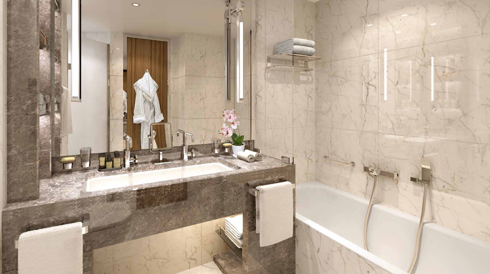 A new for Seabourn suite category featuring a semi-circular living area with comfortable seating and expansive floor-to-ceiling windows providing guests a spectacular perspective of the world outside including sweeping views from their suite. A queen-sized bed or twin beds are also oriented to face the windows, allowing guests to enjoy views of scenery, sunrises and sunsets. The bathroom features a separate shower and large soaking tub placed next to a window.