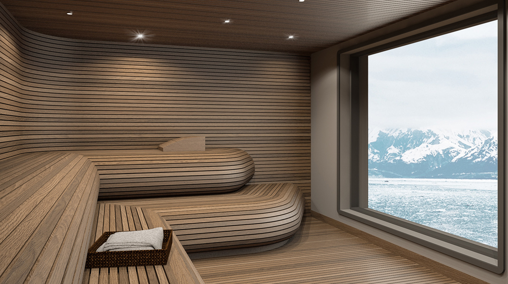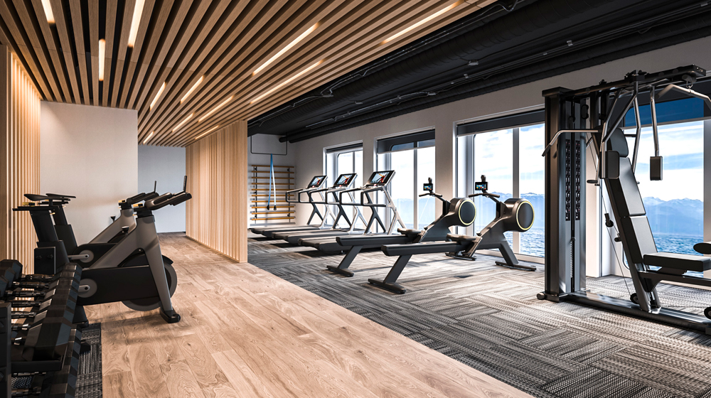 Wellness Centre – A modern space featuring three distinct areas where guests can unwind before their next adventure: a luxurious spa with a wide range of treatments, a state-of-the-art sauna featuring floor-to-ceiling windows, and a fully equipped fitness room with separate yoga space.