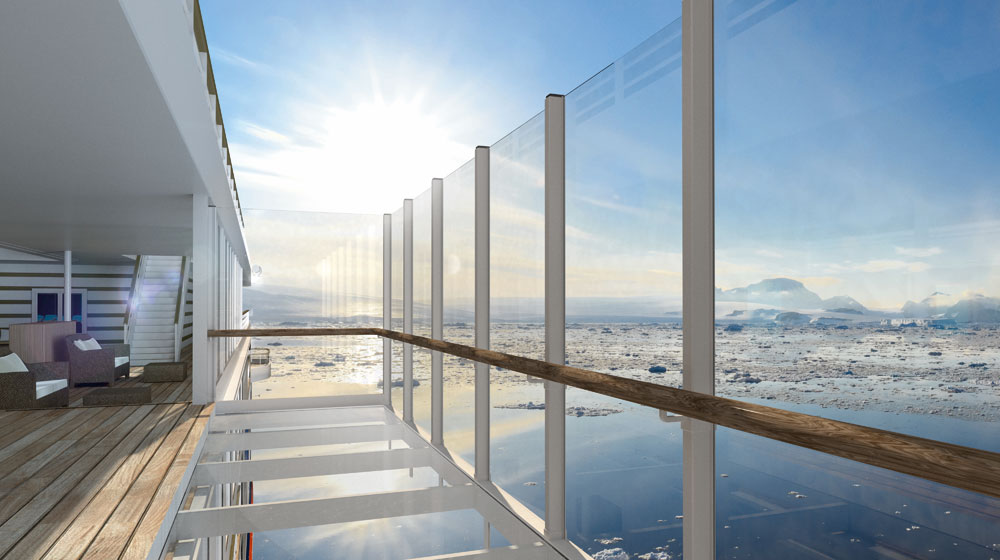 The internal designs of the spacious outside cabins, suites and public areas have been inspired by nature – reflected in use of curved lines, natural colours and tones, using only quality materials – combining to create a harmonious, relaxing concept throughout. Particularly innovative features enhance the guests’ adventurous journey: there is more open deck space than on any other expedition ship, while the deck tour at the bow and the glass balconies offer new perspectives on all sides. Fascinating talks in the HanseAtrium and the interactive Ocean Academy, a knowledge lab with a large study wall and an interactive science poster, will take guests on their personal research trip.