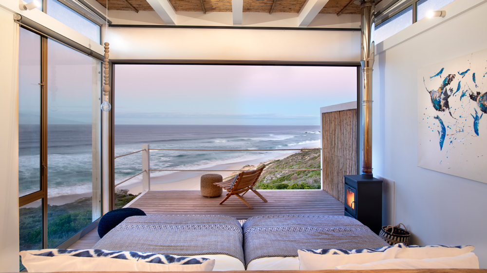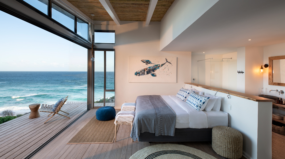 Rooms at Lekkerwater are perched on a cliff just metres back from the coast line, affording panoramic views of the ocean ahead and dolphin and whale watching right from the bed. Guests can expect to see seasonal southern right whales, but year-round pods of dolphin play in the waves right outside the lodge.