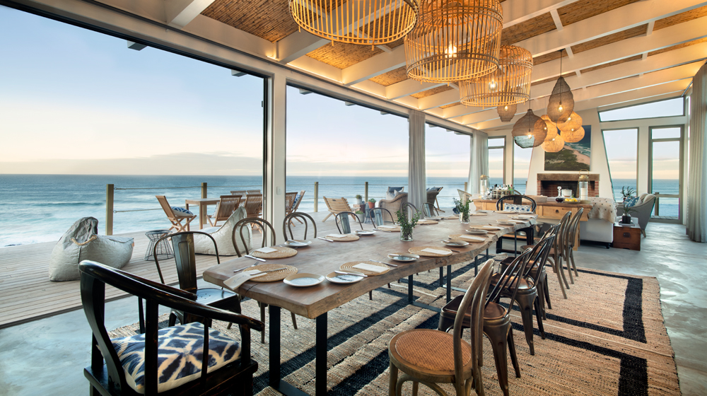 The main area offers 180-degree views of the coastline with vast, panoramic windows which open up and blur the lines between outside and in. A large communal table dominates the interior space, intended to bring guests together over meals to chat and share stories. The internal courtyard offers a more secluded space for relaxed meals and a ‘calm zone’ for relaxing by the swimming pool.