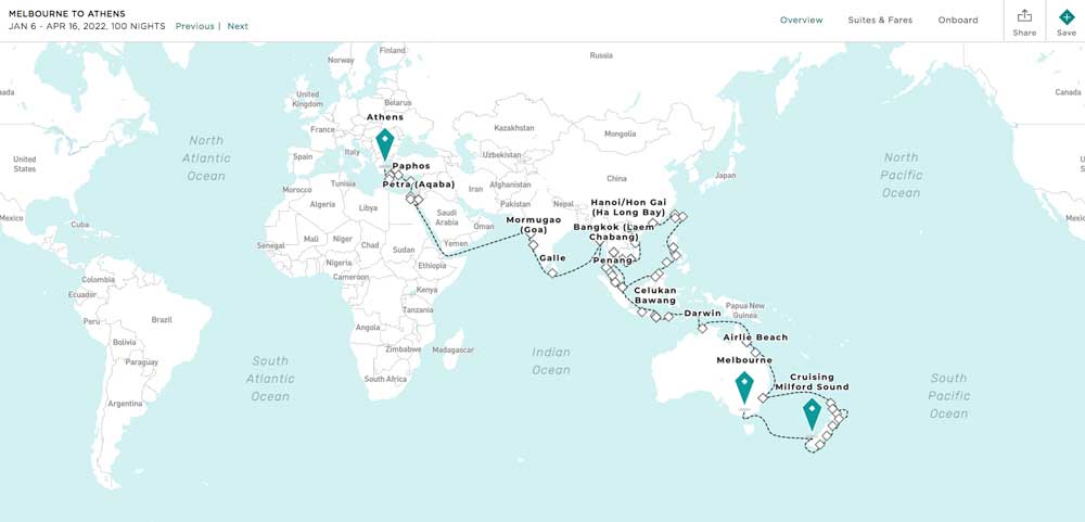 The new line-up of departures includes a 100-day voyage from Melbourne to Athens, departing on 6 January 2022, that will visit New Zealand, followed by Sydney, Airlie Beach, Cairns, Darwin, and then Indonesia, Vietnam, Thailand, Sri Lanka, India, the Middle East and Mediterranean, concluding in the Greek capital on 16 April 2022.