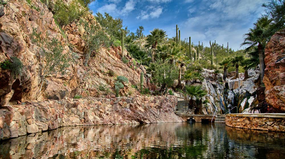 From The Phoenician, I was driven to Scottsdale airport, about 20 minutes from Sky Harbor, and then to Western Sky Helicopters, in the adjacent block. There, thanks to the capable pilot of the five-passenger Bell 429-55, we flew over Phoenix and Scottsdale suburbs, and over Lake Pleasant, a 1500-hectare reservoir created in 1927 by the Carl Pleasant Dam. Shortly after, and 20 minutes flight time in all, the helicopter landed in the front garden of the retreat-luxury Castle Hot Springs resort, northwest of Phoenix.