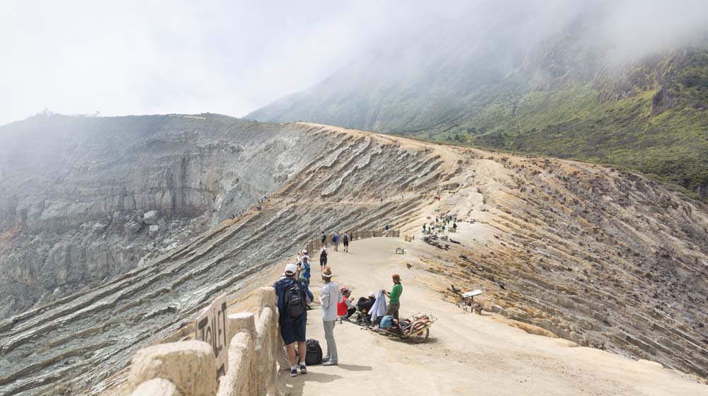 Not so for the men who men toil at the one-kilometre-wide turquoise blue – and highly acidic – crater lake and carry baskets filled with weighty kilos of sulphur on their backs to the crater rim and manually trolley them back down the mountain. We are in awe.