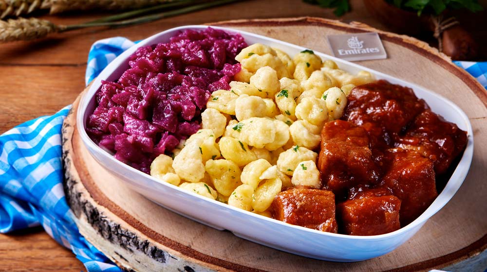 For those travelling in Economy Class on flights from Dubai to Germany, Emirates serves Leberkaese with sauerkraut and mashed potatoes on request and a piece of delicious Bienenstich for dessert. On routes from Germany to Dubai, passengers are spoilt for choice between two typical dishes: Beef with caraway sauce & Knöpfle or Nuremberg grilled sausages with sauerkraut.