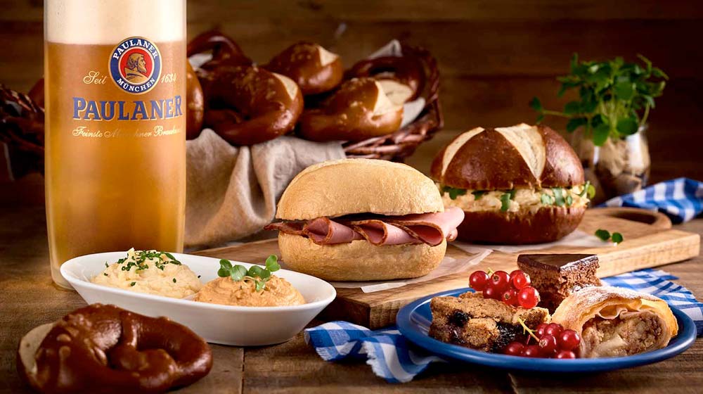In the Emirates airport lounges in Düsseldorf, Hamburg, Frankfurt and Munich guests can find typical Bavarian delicacies in addition to the regular offering. Customers can choose from Bavarian snacks such as Leberkaese, Weisswuerste, chicken legs, potato salad, Obatzter or pretzels.