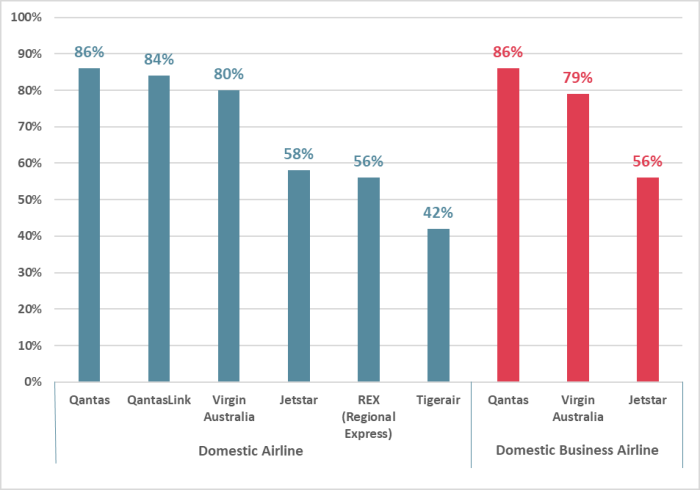 In the Domestic Business Airline category, Qantas again led with a rating of 86%, followed by Virgin Australia (79%) and Jetstar (56%).