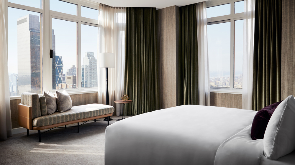 Six Sky Suites (83 square metres) reside on the top floors of Conrad New York Midtown and are designed with open layouts that incorporate a study, dining and living rooms as well as king-size bedrooms.