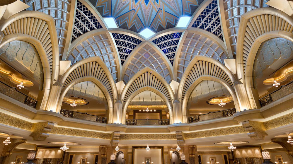 The Emirates Palace hotel sits on a 1.3-kilometre private beachfront, featuring 394 guestrooms and suites, 12 restaurants and bars, 40 meeting rooms, a concert-grade auditorium and a ballroom that can accommodate up to 2,500 people. Leisure facilities include a marina, two swimming pools, a spa and two fitness centres.