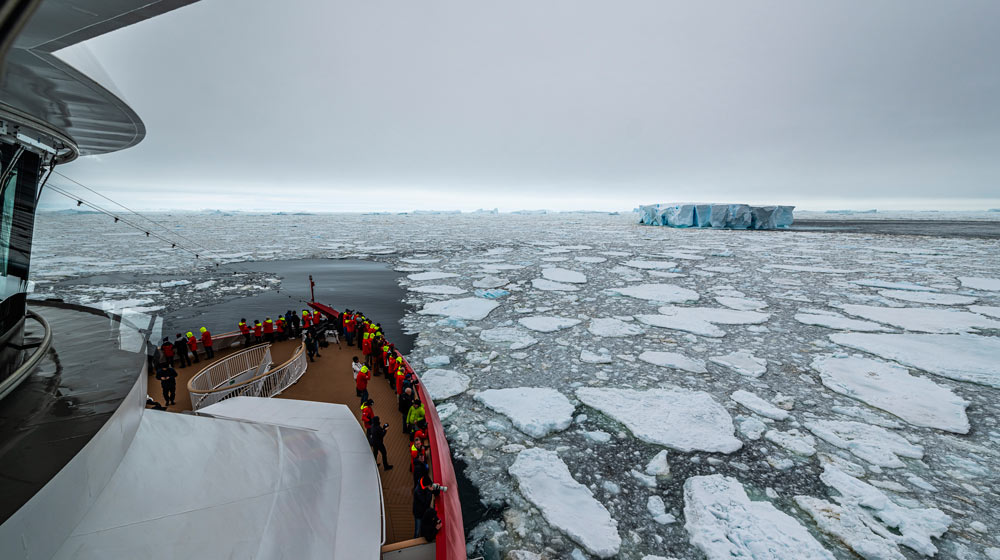 After crossing the Antarctic circle earlier this month, MS Roald Amundsen‘s Captain Torry Sakkariassen and his crew continued to push south. At 4.15pm, Antarctica time on 19 February, the vessel reached the ice edge at 70°10.208’ south.