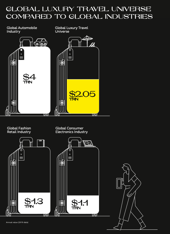 Comparatively speaking, the global automobile sector, valued at US$4 trillion, is double that of global luxury travel. However, the global fashion retail industry is well below travel at US$1.3 trillion and the global consumer electronics industry is a fraction over half the value of travel, at US$1.1 trillion.
