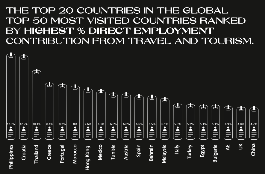 - 105.9 million individuals are working directly in the travel industry in the top 50 most visited countries, with travel and tourism contributing 10.9% of GDP in those nations.