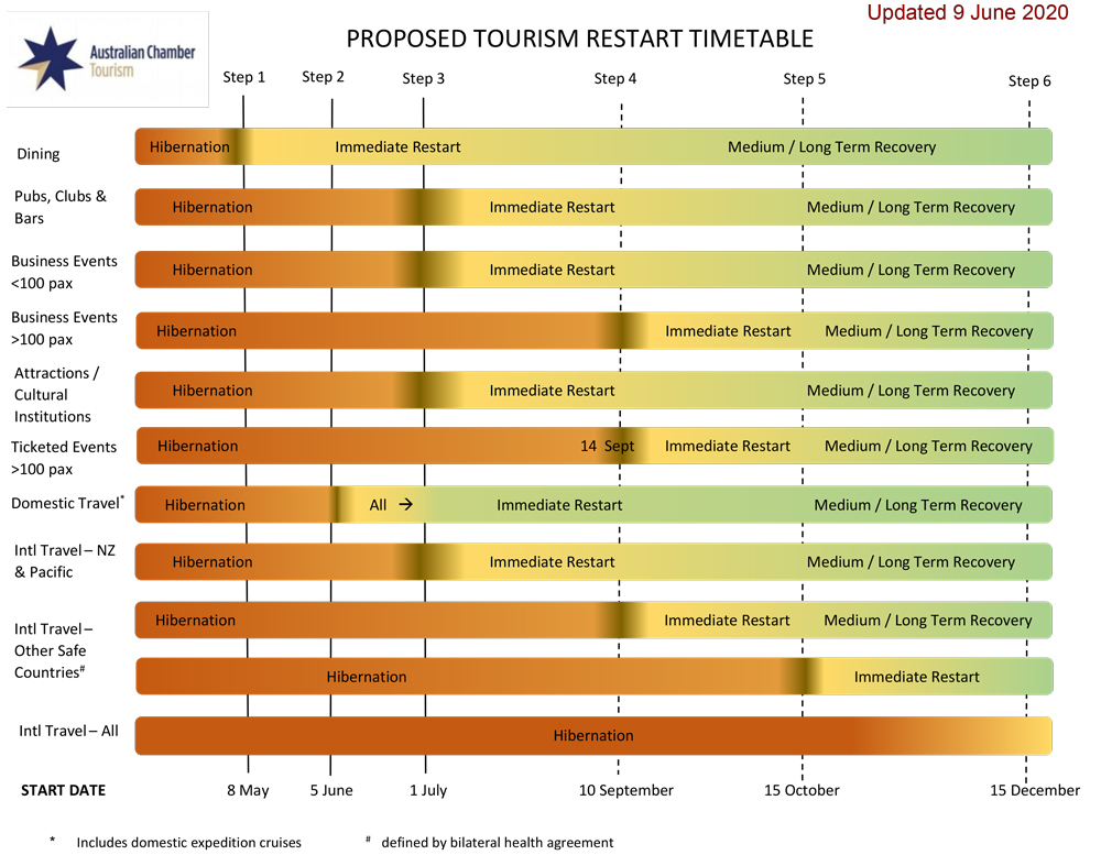 Unveiled by the Australian Chamber of Commerce last month, the timetable revolves around three phases in the rebound process – Hibernation, Immediate Restart and Medium/Long Term Recovery – and pinpoints key segments such as dining, pubs, business events, domestic and international travel (including cruising), along with tourist attractions, ticketed events and cultural institutions.