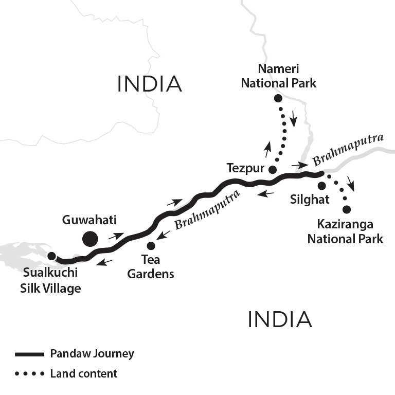 The voyage departs upstream, making ports calls in Tezpur to visit the temple of De Parbatia and explorations of Nameri National Park, which includes a float trip on the Jia-Bhoreli River for birdwatching and the chance to spot wild Indian elephants, and the UNESCO World Heritage Kaziranga National Park for a jeep safari – home to the Indian one-horned rhino, the Indian wild water buffalo and royal Bengal tiger.On the downstream journey, guests will visit a tea estate, a historic plantation house and observe the production of silk.
