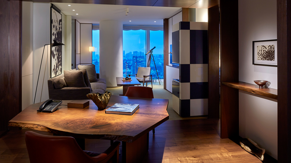 Andaz Tokyo Toranomon Hills is a 164-room hotel that stresses indigenous, which includes elevator cabin walls decorated with Tai fish made of white washi paper, as a sign of “celebration” in the Japanese tradition. We soared up to the 51st-floor lobby-reception and changed elevators, down to the 50th floor to find room #5028, identified by four protruding digits 20 centimetres off the floor. My key card is in a handmade yellow paper cover. Inside, two straight walls are panels of white washi-looking shoji, with big inset mirror panels. Designer Tony Chi has gone for a forest-like interior feel. The mottled moss carpet reminds me of a beautiful Japanese garden.