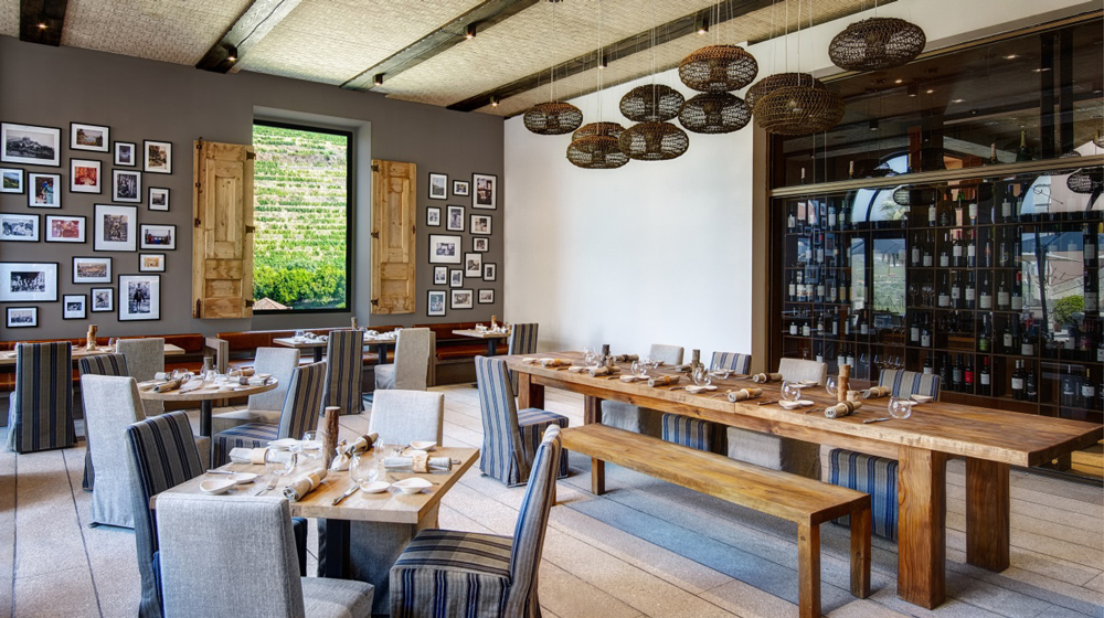 I entered Six Senses Douro Valley at the top, on the eighth floor, and looked through picture windows at hillsides of terraced vineyards. Back down on the fourth floor, we walked to the 70-square-metre end room, number 406. It was taupe throughout, from the unpolished wide board wood floor and walls to the six-person L-shaped sofa, with an off-white mansard ceiling above. A trio of three-metre-high French windows leads to a balcony. They, and two more windows, all have hand-operated floor-length taupe gauze curtains and easy-operated electric black-out blinds. The main room’s centrepiece is a raised bathtub, encased in a taupe marble coffin. The main bathroom, in an alcove, has a pair of oval washbasins set in black granite.