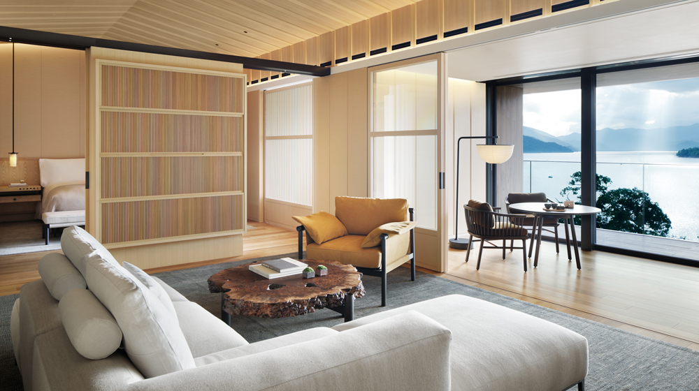 The hotel’s 94 spacious guest rooms and suites all feature a private balcony that flows seamlessly with an engawa lounge area, offering an expanded space for guests to take in the striking scenery surrounding the hotel.