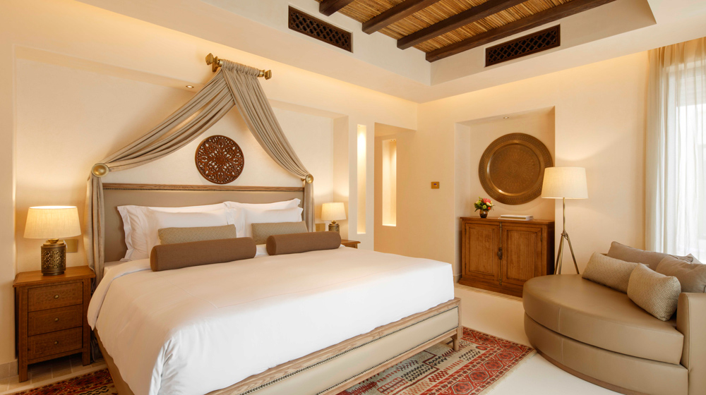 Inspired by native architecture and the destination’s rich history, the resort’s 103 guest rooms and villas feature traditional Arabesque flourishes, mashrabiya detailing, and Bedouin accessories. The spacious villas come with private plunge pools and a patio that boasts unlimited views of the surrounding Arabian Desert.