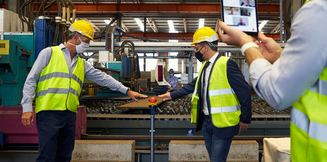 Lead image: Shipyard Managing Director Marco Ghiglione presided over the ceremony in San Giorgio di Nogaro, Italy with Seabourn Cruise Line President Josh Leibowitz joining virtually. With Ghiglione is Cyril Tatar, VP of new build services for Holland America Group. They are pictured pressing the button to signal the start of steel cutting.