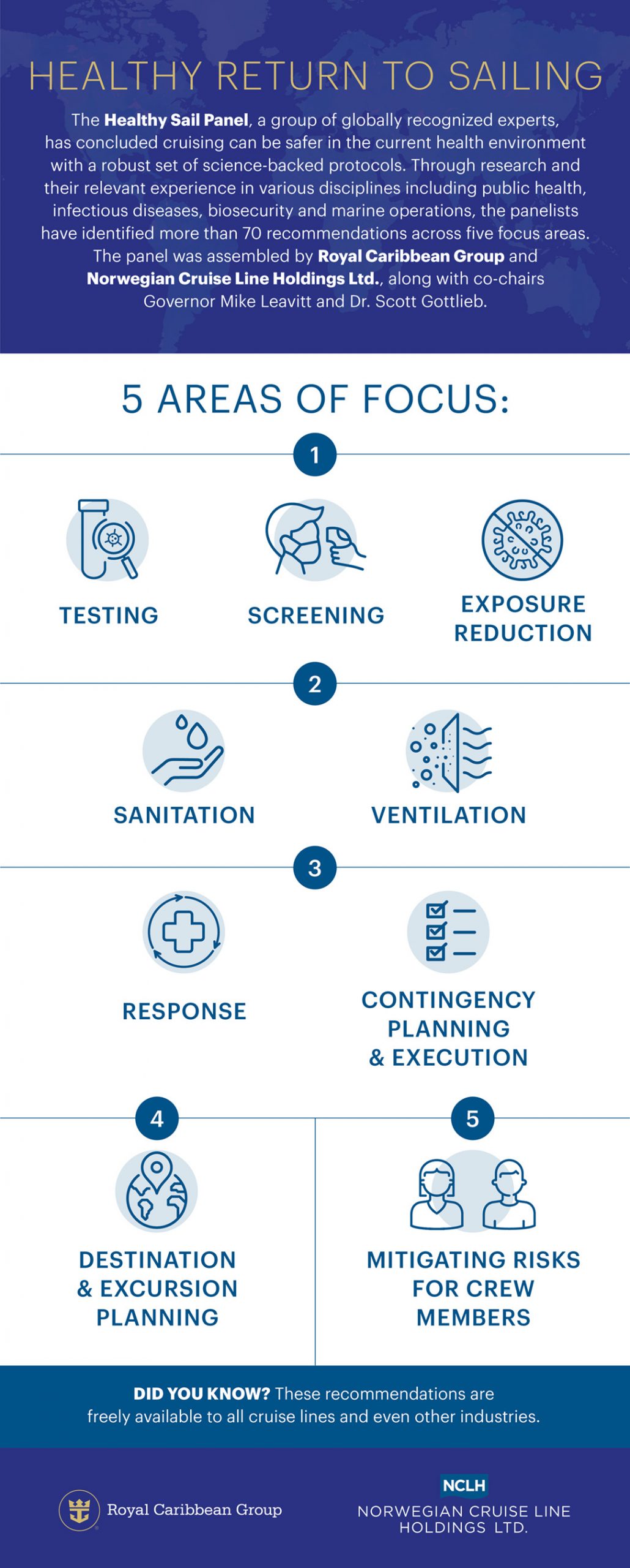 The Healthy Sail Panel identified five areas of focus every cruise operator should address to improve health and safety for guests and crew, and reduce the risk of infection and spread of COVID-19 on cruise ships. They are: