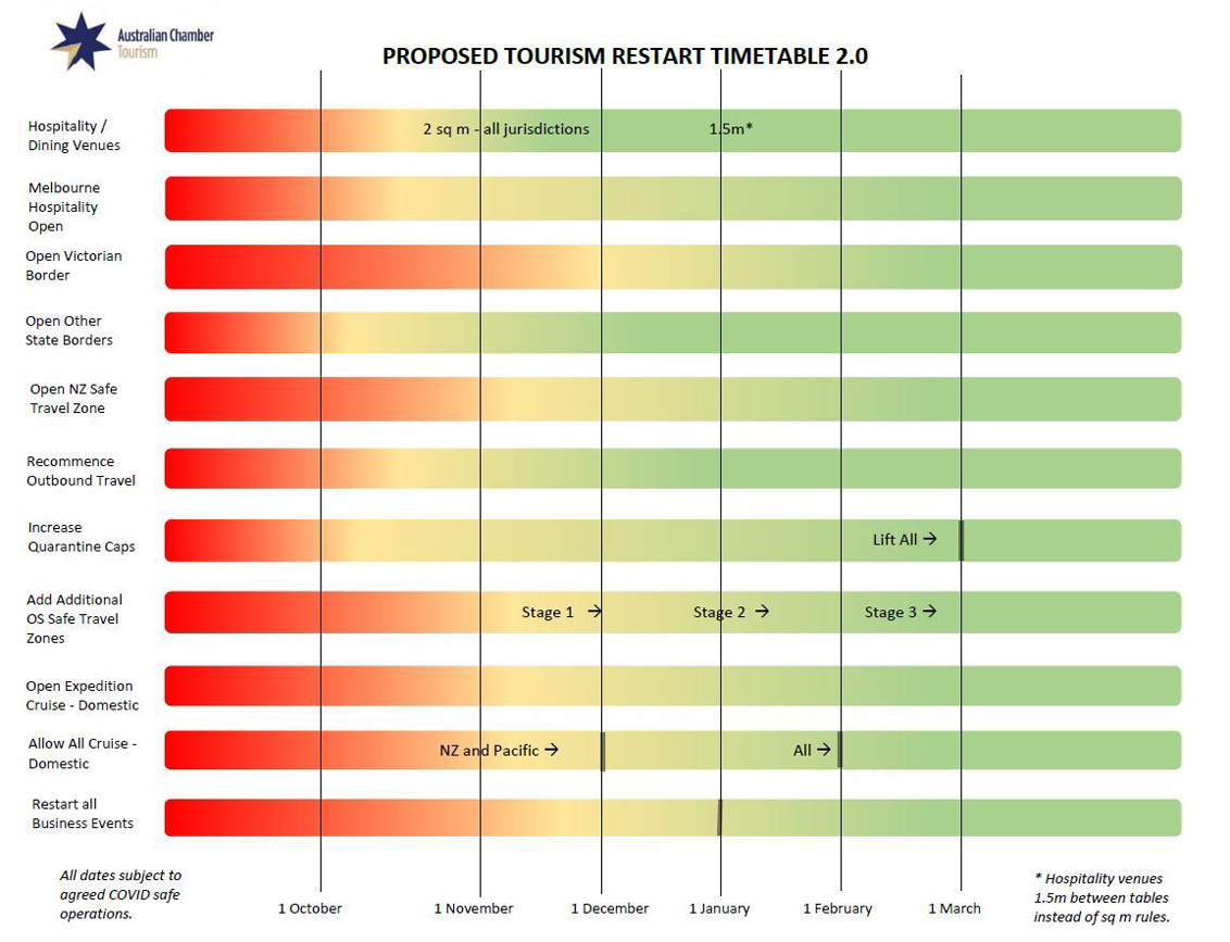 The updated timetable was released following the latest meeting of the Taskforce on Friday (25 September, 2020). This new proposal “reflects what industry feels are realistic restart targets” based on suggestions from government and health authorities taking into account current COVID conditions.“The timetable focusses on restriction easing in Victoria, followed by state border reopening and international travel restart, both inbound and outbound,” the minutes from TRT’s latest meeting state.