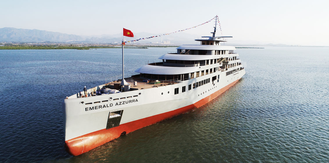 The new ocean-going super yacht Emerald Azzurra from Emerald Cruises was floated out for the first time last weekend at The Halong Shipbuilding Company in Vietnam, marking just over a year until guests will be able to set sail on the upmarket vessel.
