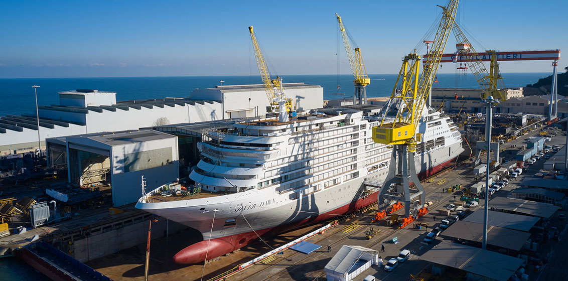 Silversea Cruises’ new ship Silver Dawn touched water for the first time during her float-out at the Fincantieri shipyard in Ancona, Italy late last week.