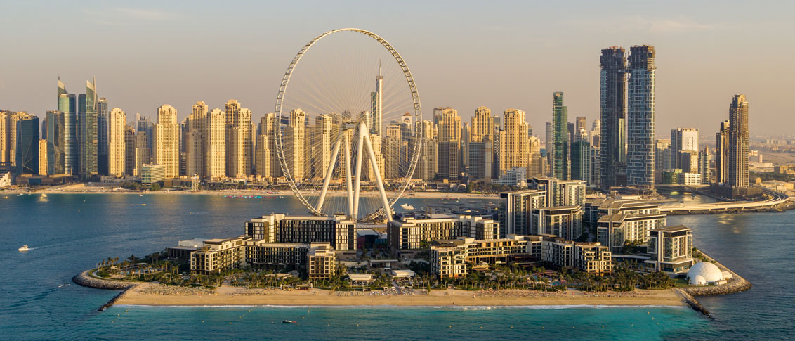 This is a five-floor hotel on Bluewaters man-made island, and all 189 rooms and suites have ample glass-walled balconies looking directly down at lush green gardens, with, 100 metres beyond, what locals say is the best beach in Dubai, with the blue ocean beyond. Turn slightly to one side, and you see what will be the biggest Ferris wheel in the Middle East, opening in a couple of months’ time.