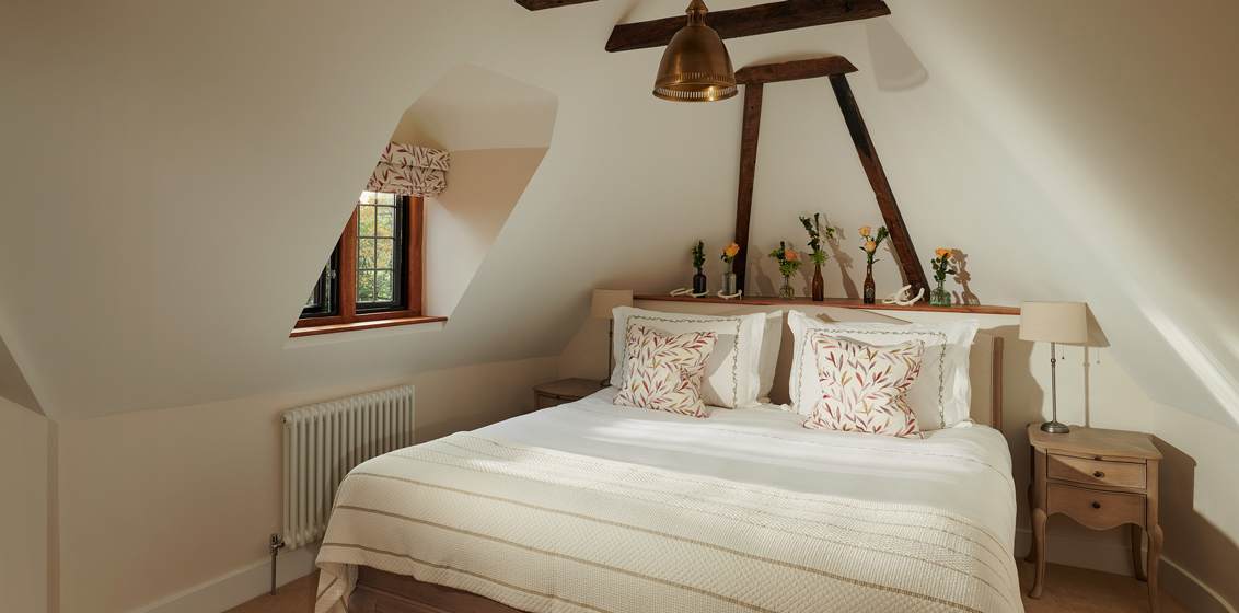 The master bedroom is a large airy suite with a super king-sized bed, high ceilings and dual aspect views of the meadow and the private garden. An en-suite bathroom features a signature Coworth Park copper bathtub, double vanity, and a large walk-in shower. The Turret room features a king-sized bed, a walk-in dressing area and en-suite bathroom with signature copper bathtub. A further double room, known as the Snug, has views across the wildflower meadow and a family bathroom adjacent to it.