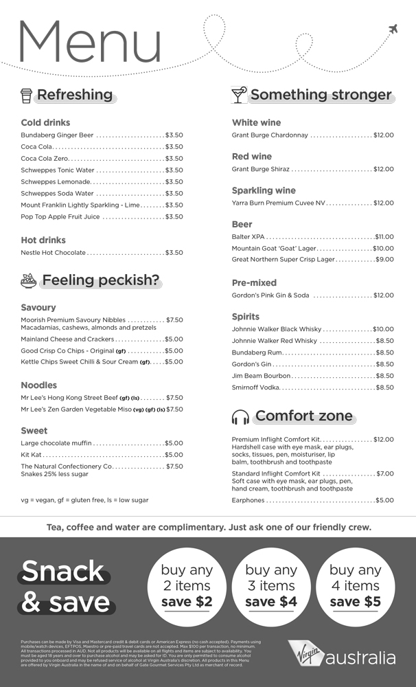 New onboard menus have been introduced on all Virgin Australia flights to give customers more choice and better value. The menus include a fresh new Business Class menu focused on quality and simplicity and a buy onboard menu of popular snacks and drinks for Economy guests.