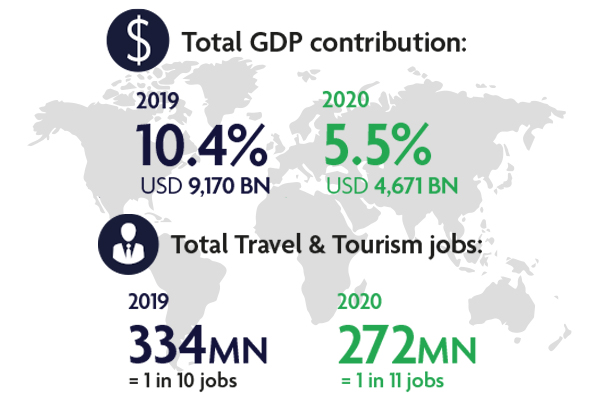 Altogether, the sector’s contribution to global GDP plummeted to US$4.7 trillion in 2020 (5.5% of the global economy), from nearly US$9.2 trillion the previous year (10.4%).