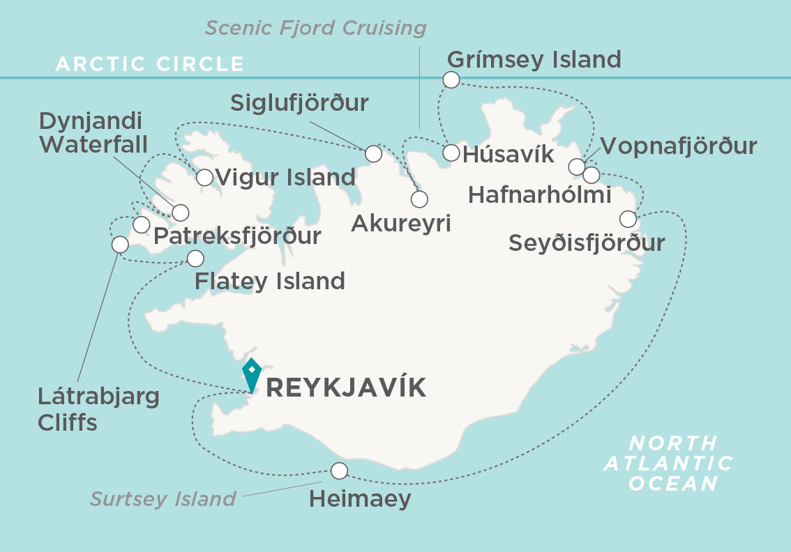 Guests will have the rare opportunity to stand on the Bridge Between Two Continents, which spans the Mid-Atlantic rift and connects North America with Eurasia. Two of Iceland’s three UNESCO World Heritage Sites are also featured: Þingvellir National Park and sailing around volcanic Surtsey Island.