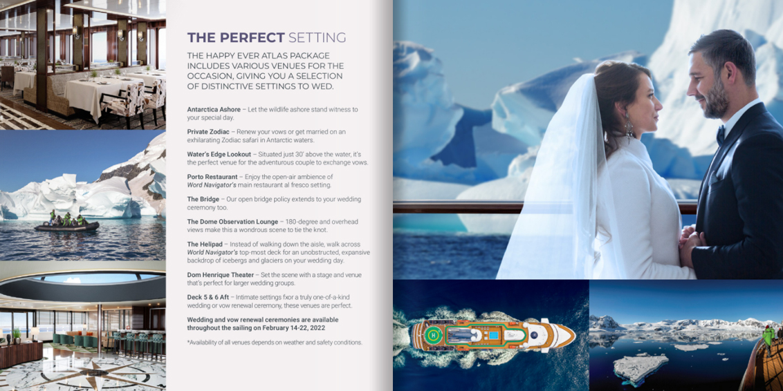 World Navigator’s Happy Ever Atlas voyage will offer couples the most unique setting to exchange their vows for a wedding day they will never forget.”