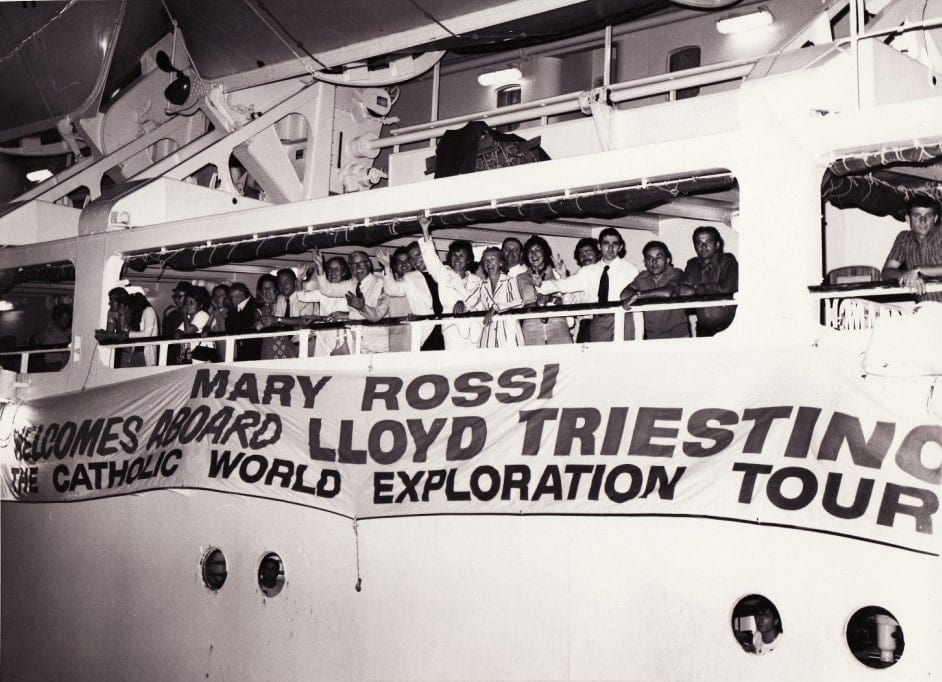 Mrs Rossi had made the move across to travel from a highly successful TV career in which she was the first woman in Australia to have her own televised program – A Woman’s World with Mary Rossi – on the ABC. The weekly national daytime show featured Mary interviewing interesting people from all around the world on current affairs.In 1969, Mary was approached by the Lloyd Triestino shipping company, Galileo and Marconi, to lead a four-month around the world sea tour to Europe, that included a six-week coach tour – from Lisbon to London, via Rome – visiting places of significance to Christians. The tour, packaged by Paxtons Travel in the city, proved to be a great success and continued to operate for many years, paving the way for thousands of Australians to have their first taste of travel abroad.