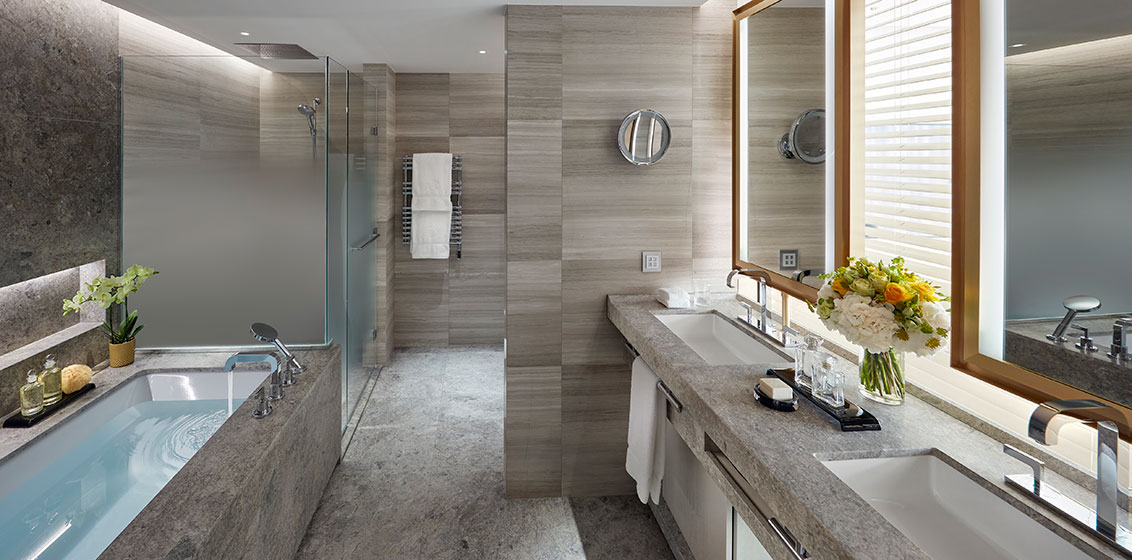 I was in 718, one of the six 65 square-metre suites on the seventh floor, added above the six-floor hotel in 2009 (there are now a total of 181 keys). Come in, to a wood-floor foyer, ecru leather-look walls. To my left, a closet has sensor-activated lights, and a safe. To the right is the brown marble bathroom, with two washbasins, a glass-walled toilet stall, and a no-door rain forest and hand-held shower. The big tub, with its own wall-set television shower, is complemented by an electric rail to warm my towels.