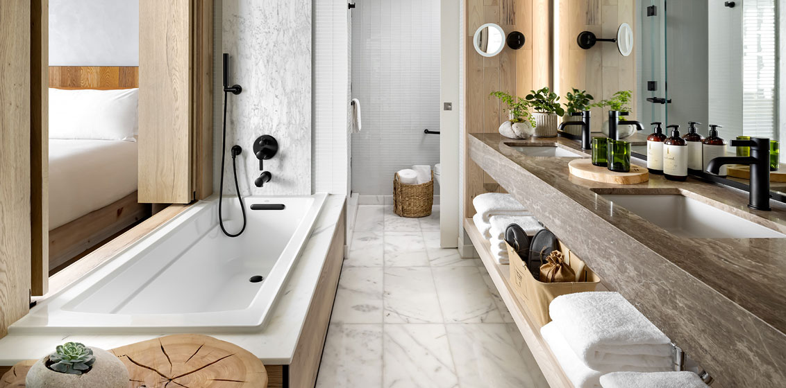 Room amenities include heated floors, plants, organic cotton linens, yoga mats, and customised organic bath products. An in-room water filtration system along with tumblers and carafes made from reclaimed wine bottles reduces the need for single use-plastics. The hotel’s in-room dining menu allows guests to eat mindfully with a selection of dishes that celebrate Ontario-grown ingredients. Other guest amenities include a rooftop pool and The Field House fitness facility.