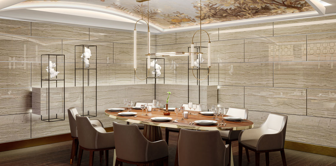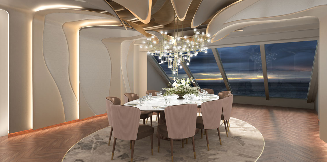 Priveé is Oceania Cruises’ marquee venue for bespoke, intimate culinary celebrations for a maximum of ten privileged guests. Dramatic backlit, debossed walls and a blooming flower petal ceiling from which a dramatic chandelier descends over the polished marble slab dining table set the stage for a memorable evening while a wall of floor-to-ceiling glass provides an exhilarating view to complement a most memorable private dinner party that can literally traverse continents.