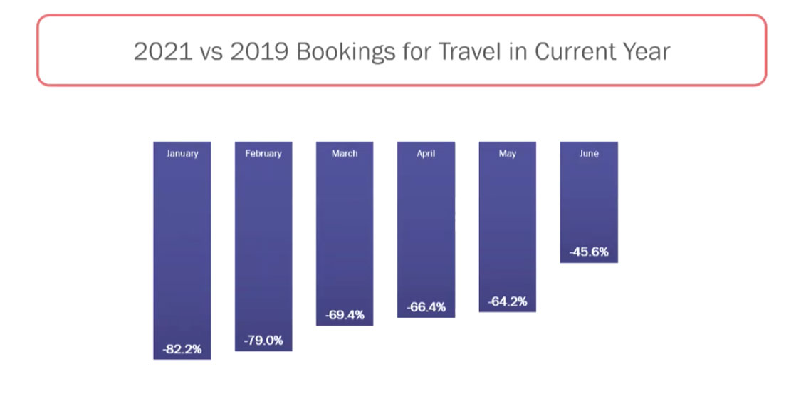 Comparing booking levels between the “high watermark for travel” in 2019 versus 2021, Virtuoso indicated a steadying improvement as the year progresses. Whereas booking levels were trailing the January level by more than 82% compared to the same month in 2019, that percentage had fallen to 45% in June.