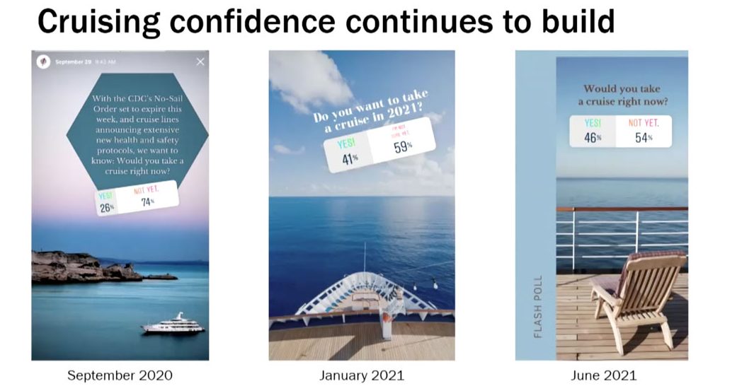Cruising confidence has continued to build. Quizzed in a flash poll on whether they would cruise right now, only 26% said yes in September 2020. That number jumped to 41% in January and increased to 46% in June.
