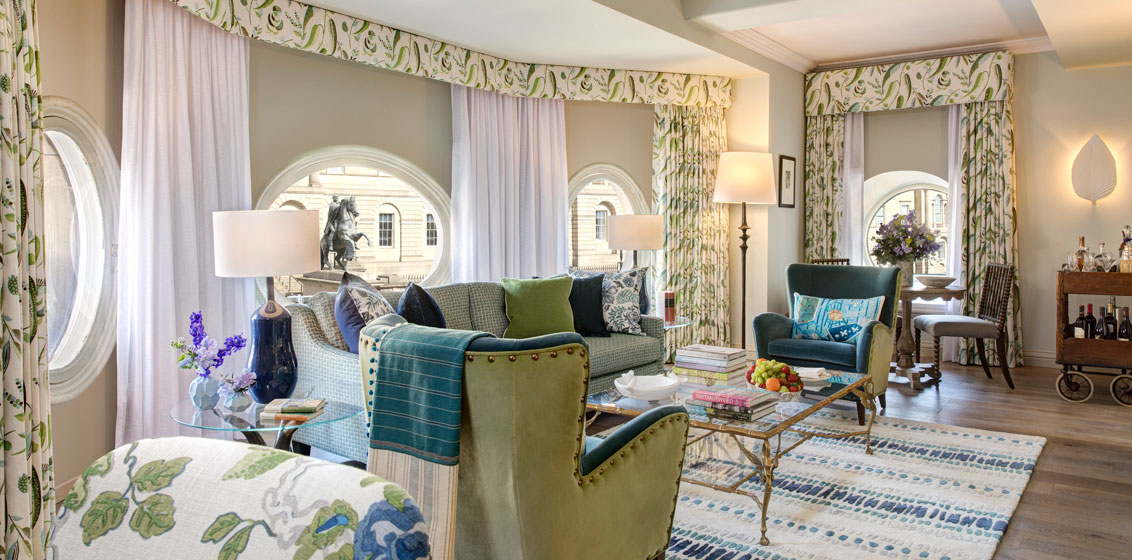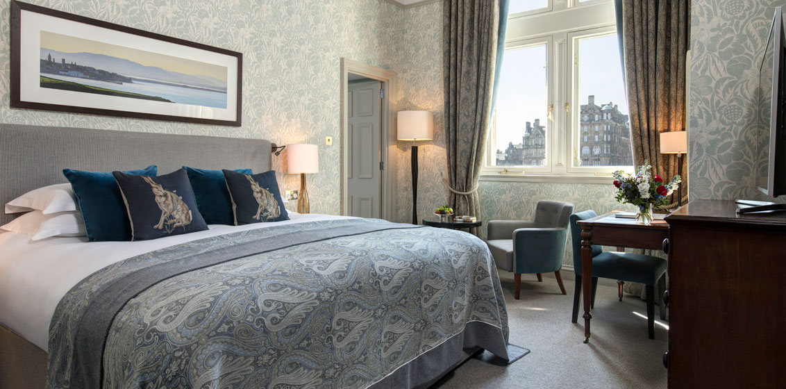 The north-front main entrance opens directly, with no turning circle, on The Royal Mile, running from Edinburgh Castle up to your left and right down to the Palace of Holyroodhouse, official Scottish home of Her Majesty. Some of the hotel’s staff, incidentally, wear trews, trousers, made of plaid tartan from Kinloch Anderson, which holds her Royal Warrant, and The Balmoral’s own tartan concierge helps you design a bespoke plaid. Want to hear bagpipes, try haggis, and over 500 whiskies?