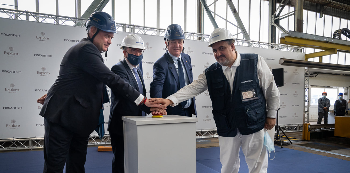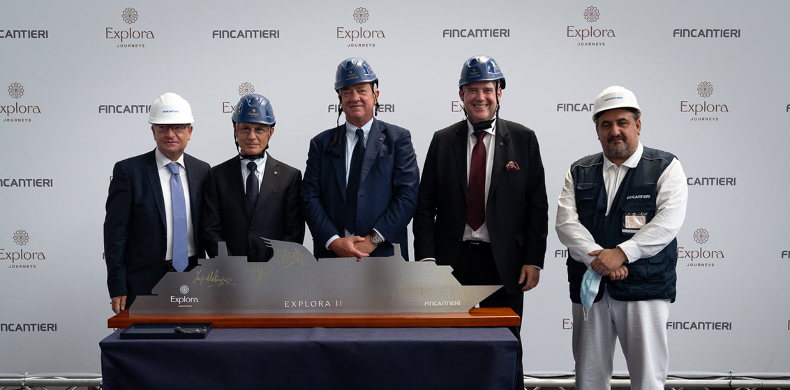 Lead image: Pierfrancesco Vago (centre), Executive Chairman of MSC’s cruise divison, flanked by executives of Fincantieri and Explora Journeys at the steel-cutting ceremony for Explora II at Fincantieri’s Setri Ponente yard in Genoa, Italy | Credit: Fincantieri