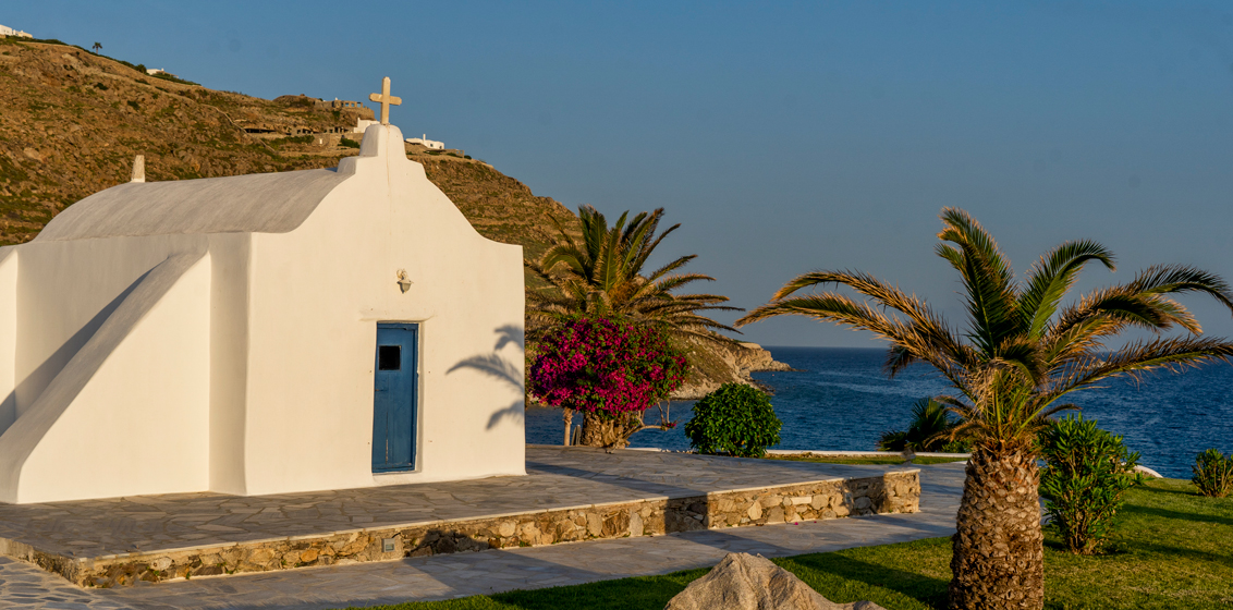 This must be the most intimate working chapel in Greece – Saint George’s, at stunning Santa Marina Mykonos, high above Ornos Bay, in the south-west of this Cyclades island. As you would expect on a Greek island in the Mediterranean, the chapel is pristine white outside, like all the buildings on the eight-hectare estate. And as you would also expect in an Orthodox chapel, of course it is a kaleidoscope of colour inside, with every square centimetre hosting an ancient icon. Take out the confessional and the space holds ten at most, so the numerous weddings, from all over the world, that are held here usually take place outside, in front of the chapel, which becomes a photo backdrop.