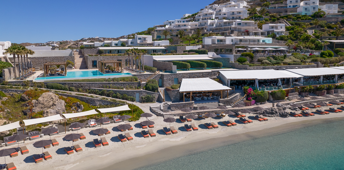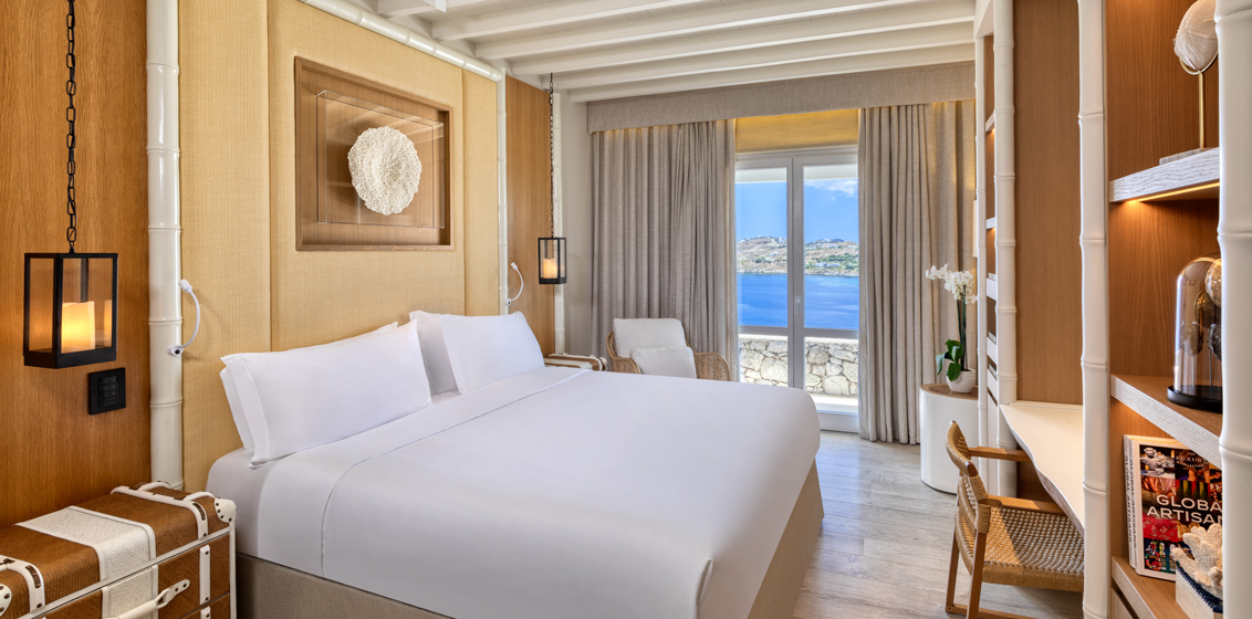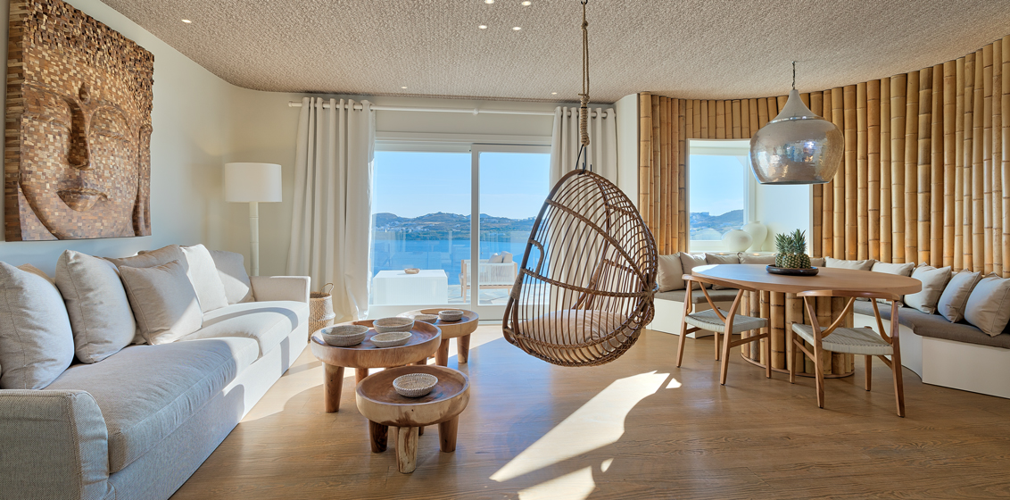 His only child, near-professional fashionista Christiana Papageorgiou, now owns and runs what has become a 114-room Luxury Collection hotel. She, like her father before her, only wants the best. Take Ruby, Villa 242, a two-floor 217sq m beauty which comes with a totally-private 170sq m courtyard (there’s a 16-metre pool). Its all-white kitchen, with Neff and Smeg bits and pieces, would delight any celebrity chef. Two bedrooms are downstairs but best sunset views are from the two upstairs. Look across the Bay to Delos Island as you watch pretty-amazing orange-gold sunsets.
