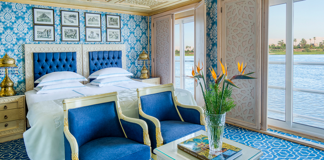 An example is the ship’s ceilings which were hand-carved in locally sourced blonde wood; carpets are inspired by Egyptian geometric shapes of the magnificent Pyramids; banquettes were handcrafted and upholstered in fabric sourced from a local fabric company; and the top deck is filled with blue-toned furniture with tented drapes to shade from the sun inspired by the ancient Egyptian Barges.
