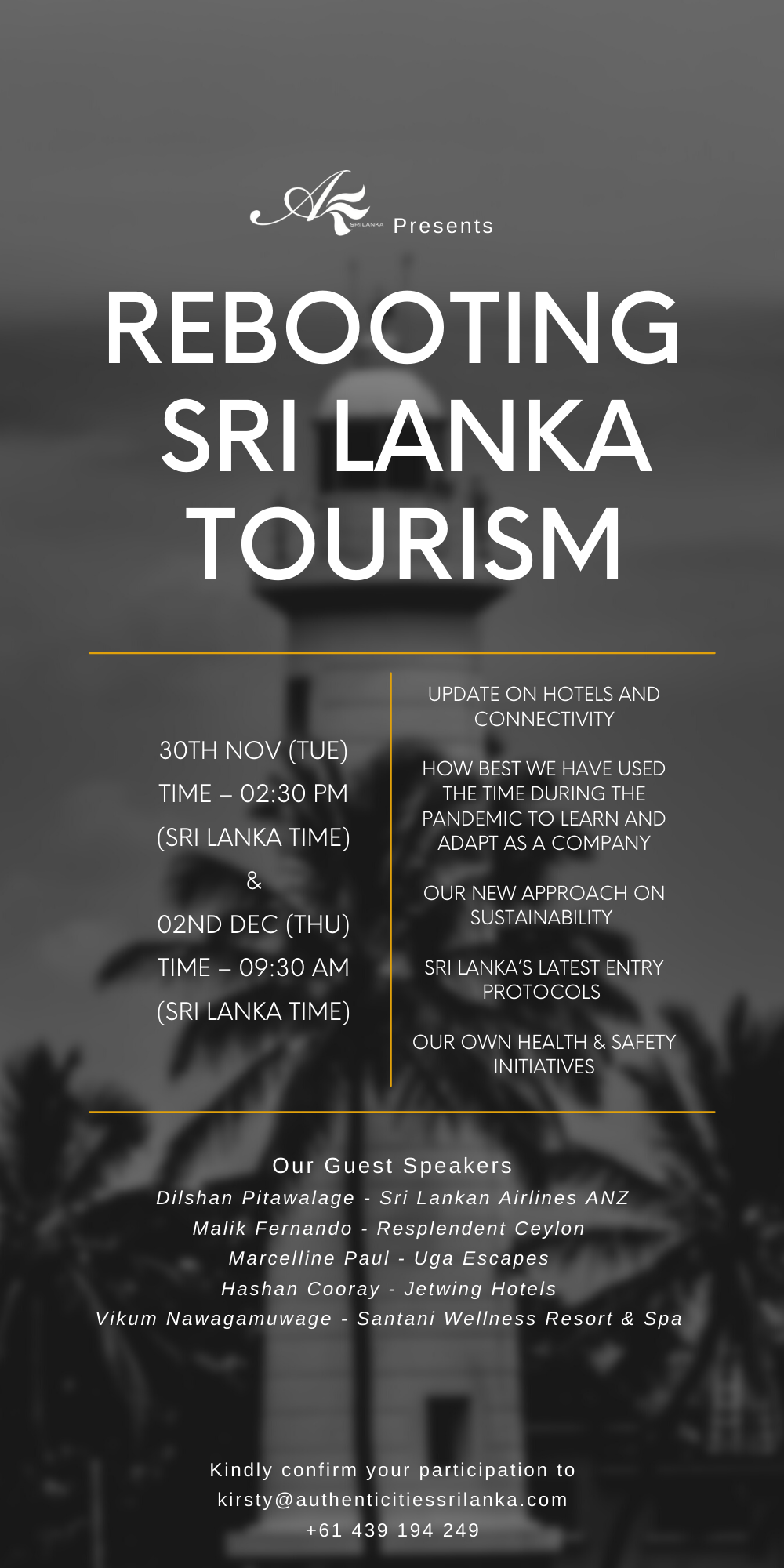 Authenticities Sri Lanka has organised some upcoming “Rebooting Sri Lanka Tourism” webinars for Australian and New Zealand Travel Advisors, to be held at: