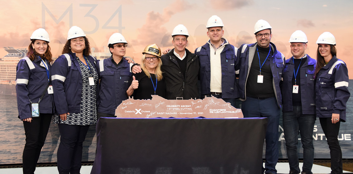 Lead image: Company executives including Celebrity Cruises CEO Lisa Lutoff-Perlo, Celebrity Cruises SVP of Hotel Operations Brian Abel, Celebrity Cruises CMO Michael Scheiner, and Captain Kate McCue signed the ceremonial first cut of steel for the fourth ship in Celebrity Cruises’ Edge Series, Celebrity Ascent, at the Chantiers de l’Atlantique shipyard in Saint-Nazaire, France.